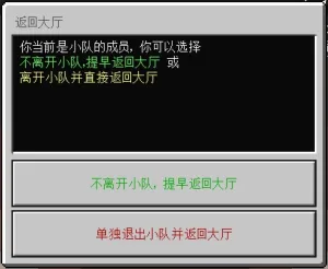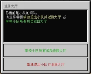 - 若队长从小游戏房间返回大厅时,系统会弹出提示框,队长可选择率领所有小队成员返回大厅和单独退出小队并返回大厅。