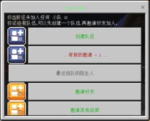 在组队系统中,点击“邀请其他玩家”,再在输入框输入想要邀请的玩家昵称,或选择一位最近在聊天栏、小喇叭发送过“组队”文字消息的其他玩家,或选择一位在当前大厅的其他玩家,再点击“提交”可向该玩家发出入队邀请。