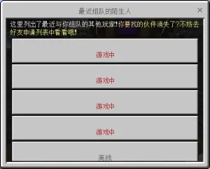 在组队系统中点击“最近组队的陌生人”,即可查看最近组队的陌生人列表,你可以查看对方在线状态、加入对方队伍、发出组队申请、发出好友申请。