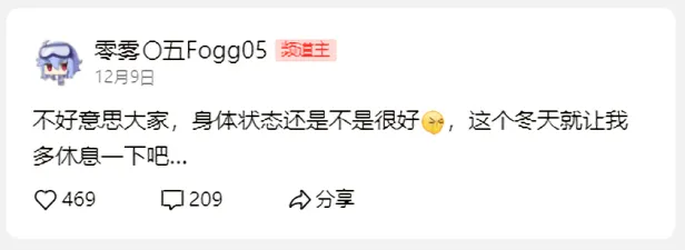 在他生命的最后时光,零雾〇五Fogg05依然心系粉丝。他在平台的最后一条动态发布于2025年12月9日:
