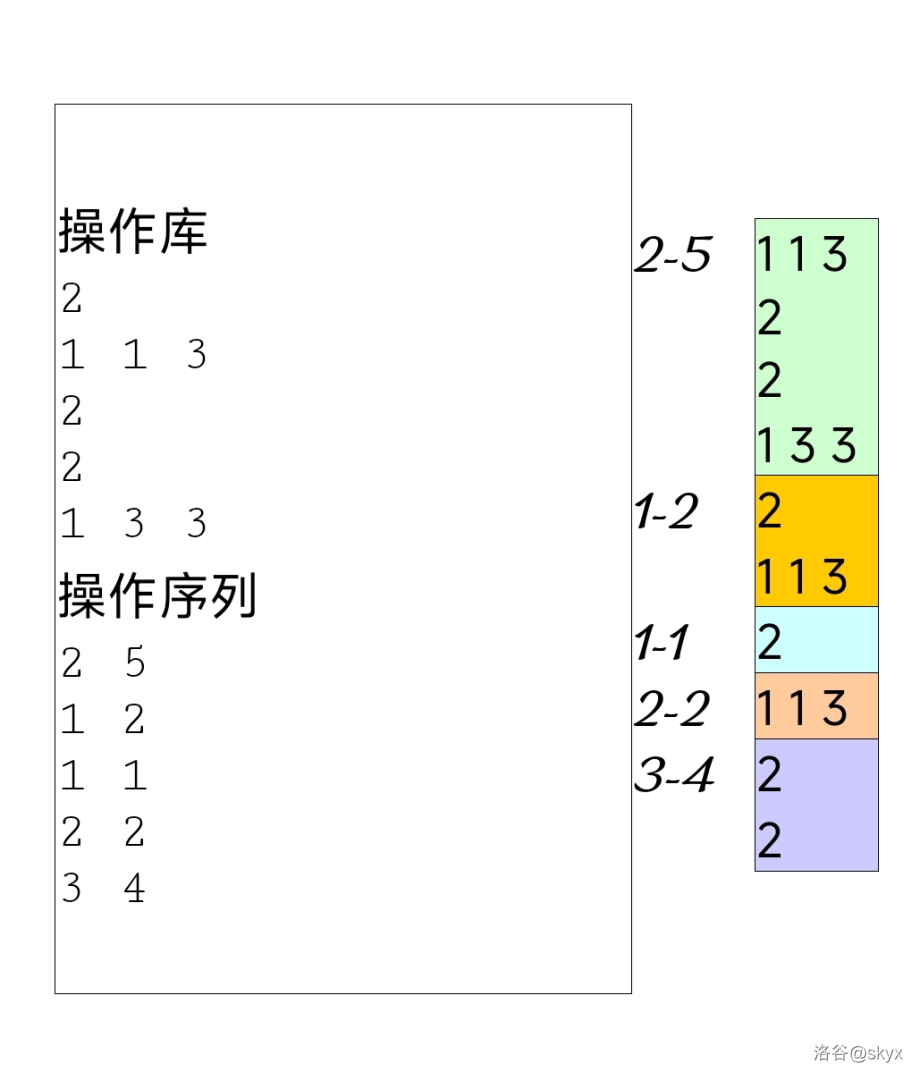 接着给出 $q$ 个区间 $[l_i, r_i]$,整个操作序列是依次执行每个区间内的操作(从 $l_1$ 到 $r_1$,再到 $l_2$ 到 $r_2$,依此类推)。