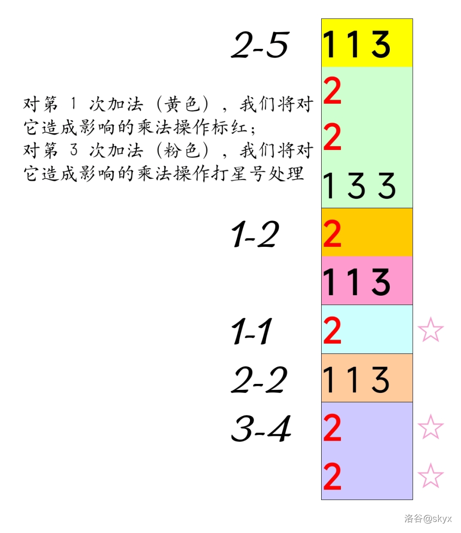 我们还是先关心区间内部的乘 $2$ 次数,乘 $2$ 操作会放大“未来”所有操作的贡献,显然我们要先搞清楚这个。